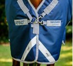 The resilient 1200D polyester waterproof and breathable outer will keep your horse dry, even in the toughest of weather conditions, and the high-cut neck design offers a close fit, paying attention to reducing wither pressure with our signature V-Front Closure system which allows your horse freedom of movement to graze without restriction. The front and rear leg arches enable your horse to move freely while keeping the rug securely in place, with additional belly coverage and three cross surcingles.