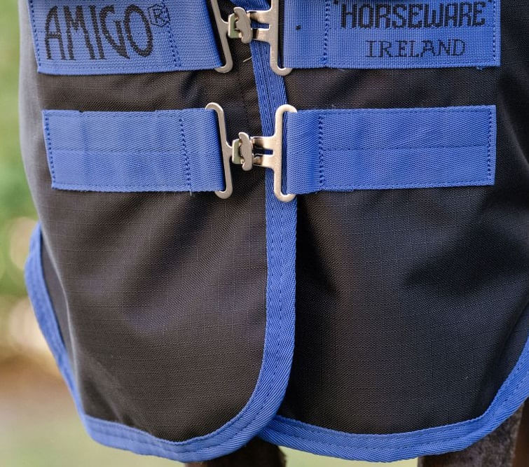 The rug is fastened at the chest with a double metal T-hook closure. At the belly, it is secured with two crossed and adjustable belly straps, and a tail strap completes the rug.