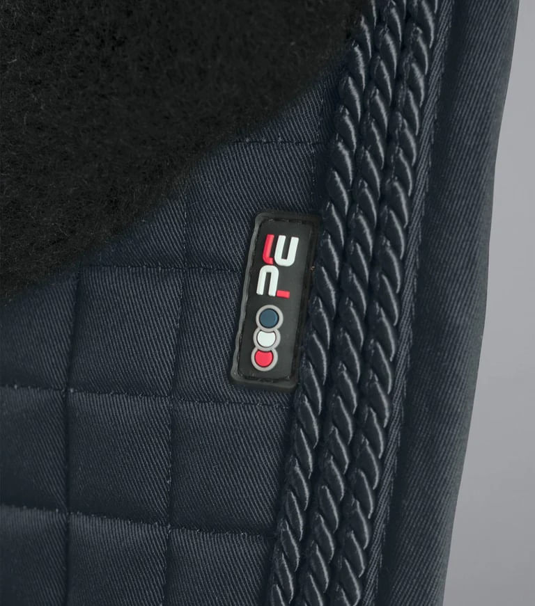 A 600 denier polyester girth cover provides anti-rub protection and double Velcro adjustable straps and adjustable D loop straps help with girthing. Decorative twisted ropes and a European style cut away hem give a stylish and sophisticated look. A truly high class wool saddle pad suitable for everyday or competition use with the advantage of being fully machine washable.