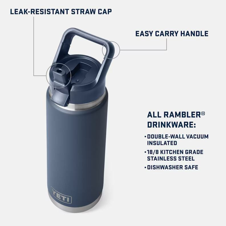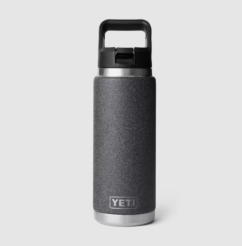 OVERVIEWWaste no time hydrating on your morning hikes, kayak trips, and daily commutes with our flip and sip colour-mathed straw cap water bottle. The Rambler 769ml Water Bottle is the goldilocks of our bottle line. It holds just the right amount for a day on the boat or at the beach, while still fitting in your Yeti backpack. It comes with a colour-matching straw cap that's leakproof when closed and easy to carry (thanks to the TripleHaul Handle). Like all Rambler Bottles, it's over-engineered and double-walll insulated to keep your water cold until the last sip, and it's dishwasher safe for easy cleaning. Plus, it comes with a wide-straw insert, so you get more drink with every sip.