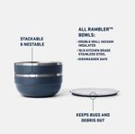 OVERVIEWThree sizes of double-wall insulated bowls keep queso piping hot, and salads cool and crisp no matter where you feast. Designed to save space, Rambler Bowls and lids nest together for organize storage in cupboards and camp kitchens.