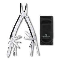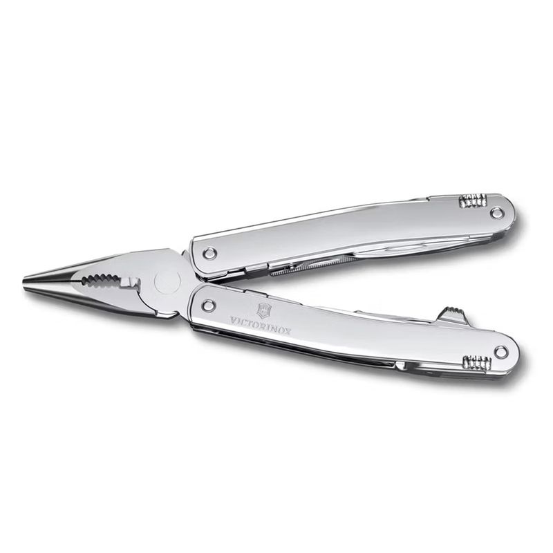 Needle-nose pliers / Wire cutter for thin and soft wire up to 40 HRc / Hard wire cutter / Blade, large / Can opener / Screwdriver 3 mm / Bottle opener / Screwdriver 6 mm / Crate opener / Wire bender / Screwdriver 2 mm / Reamer, punch / Pulling hook / Scissors / Wood saw / Metal saw / Metal file / Phillips screwdriver 1/2 / Chisel 7 mm and scraper / Cable cover longitudinal cutter / Cable cover crossways cutter / Wire stripper and scraper / Lanyard hole / Coupling for corkscrew