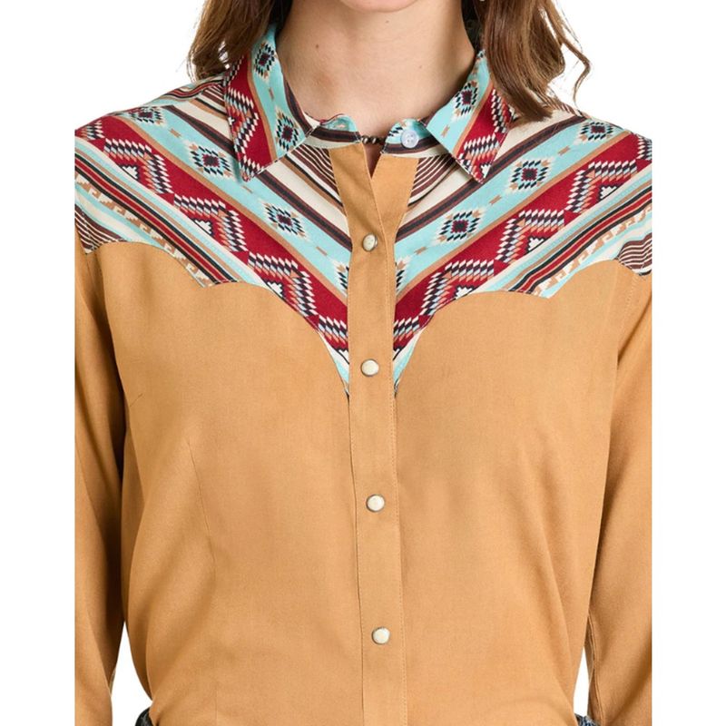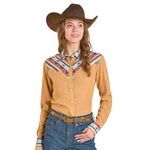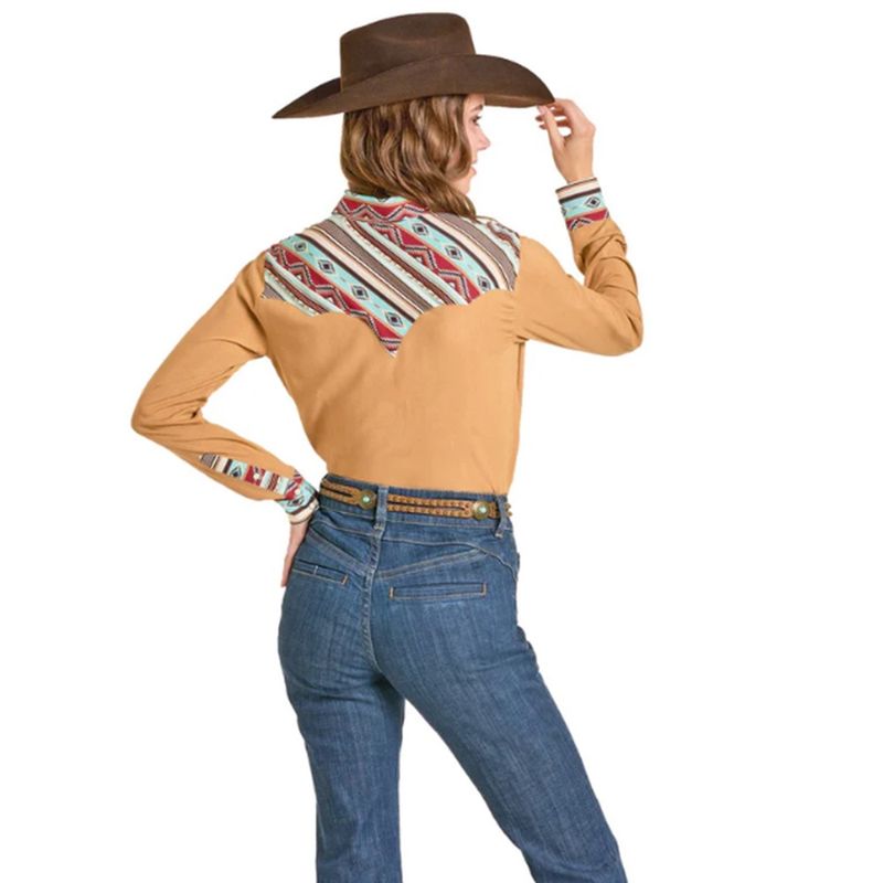 The Retro Multicolor Yoke Long Sleeve Snap Shirt is a true Western classic. Made from 100% rayon, this long-sleeve shirt features a colorful yoke and cuffs, and princess seams for a tailored fit. This shirt was designed with style and elegance, making it perfect for any Western occasion.