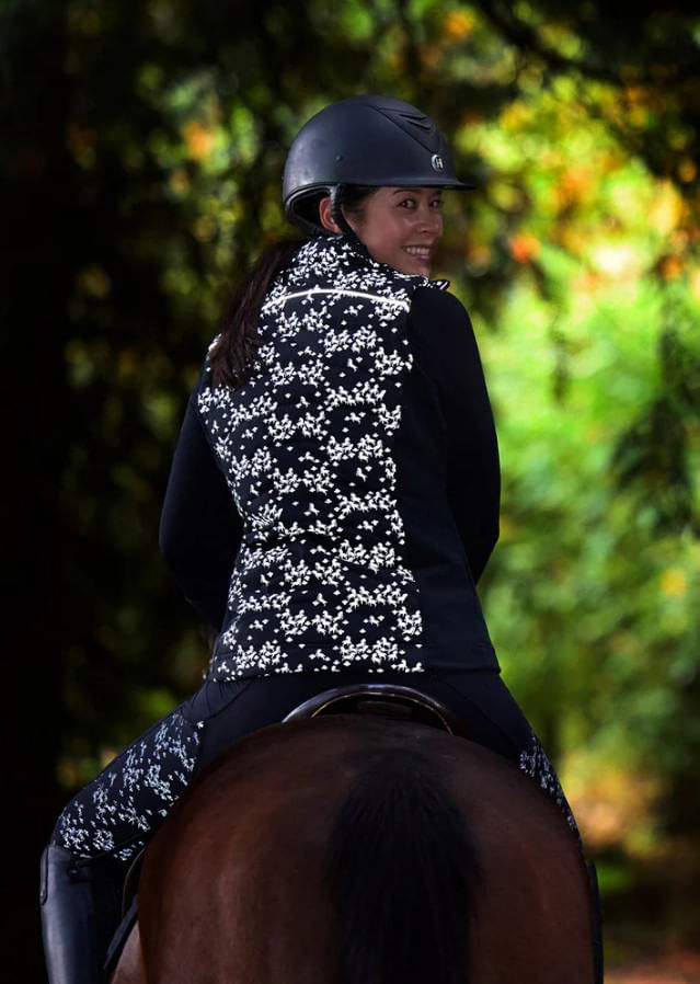 • “Happy Herds” horse print side panels are reflective for visibility at dusk